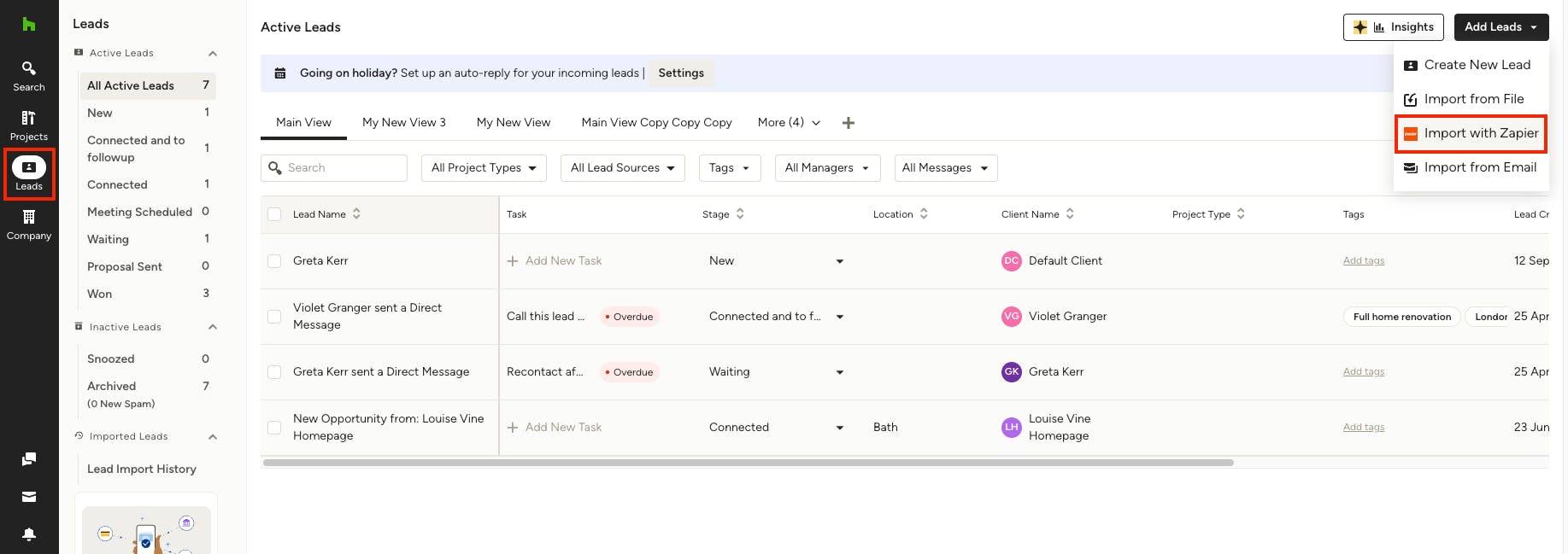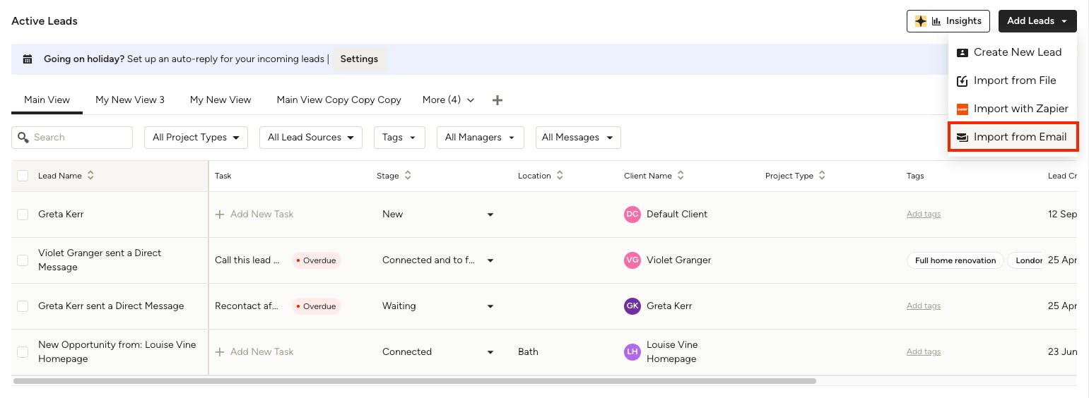 With Houzz Pro you have the ability to import leads from a file, from your email, or by integrating with Zapier, saving you precious time that can be put towards winning said leads. Learn how to add leads from a list, email or Zapier with the steps below: