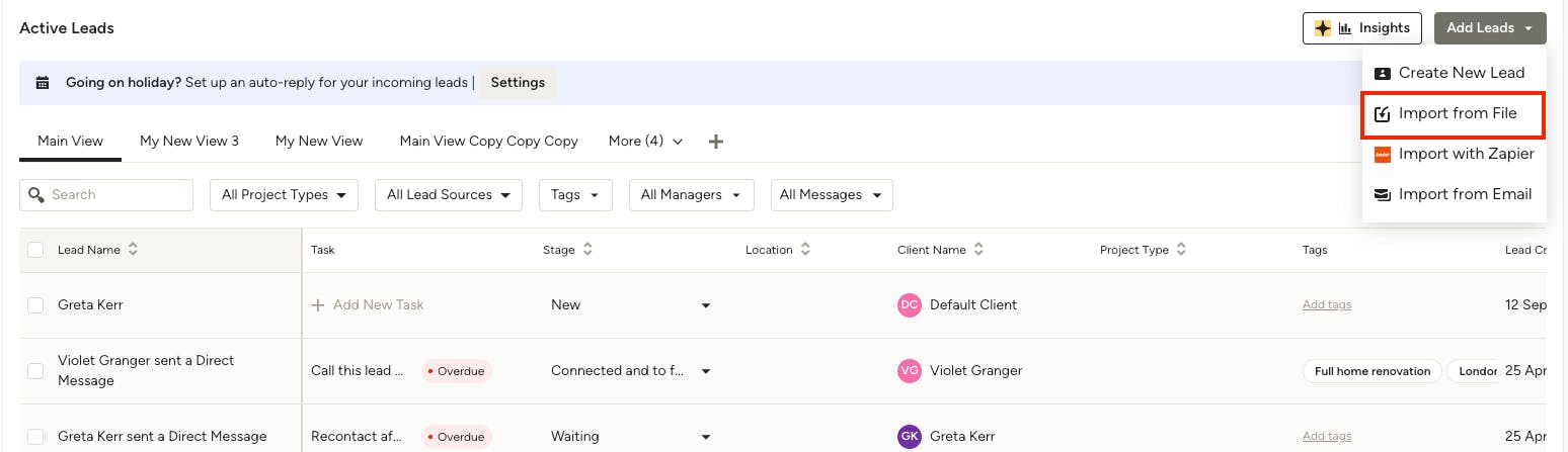 Already have a running list of leads outside of Houzz Pro? Seamlessly transfer them over in a single file to take advantage of our lead management tools. Here's how: