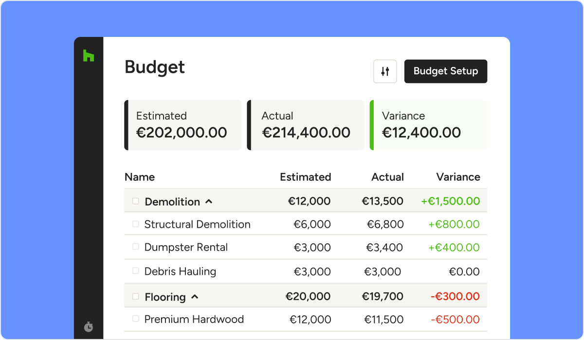 Managing your budget is a key part of managing your business. The Houzz Pro Budget Management feature makes it easy to track your project’s estimated costs versus your actual costs. You can keep track of every penny spent and see your cost variance at a glance, then export that info for your (and your client’s) records. It ensures you stay on track financially as your project progresses.