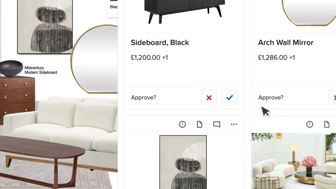 You can also import a mood board, other inspirational images and any project-related documents, such as the contract. Filter all the items by their approval state (pending, approved or declined) or type (products, services, images and so on) so you can view just what you need.