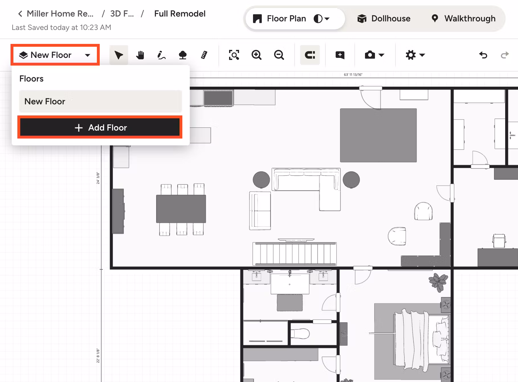Once you are ready to use your ground floor to create another level, select the New Floor dropdown at the top left of your floor plan. Click the Add Floor button.