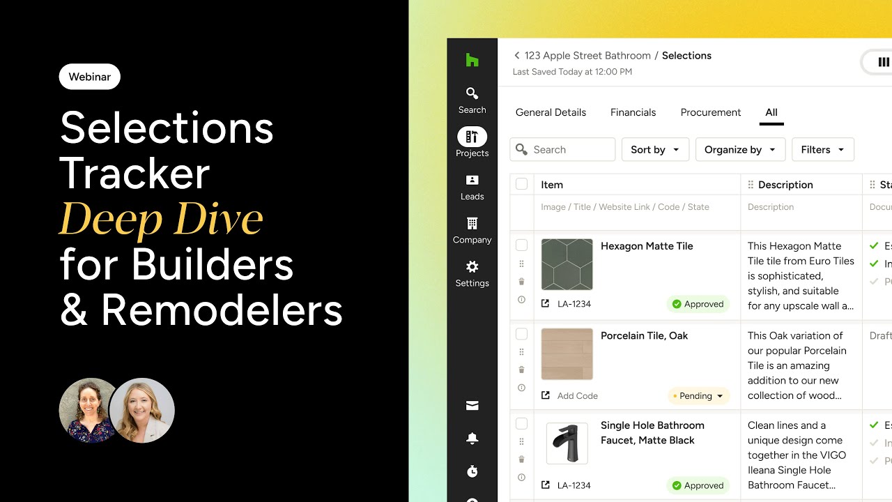 The Houzz Pro Selections tool makes keeping track of your building or remodeling project’s products and materials easy. It also lets you track the budget and client approvals in real time and access client comments on selections, all in the same place. And now we’ve upgraded the feature to make it work even harder for you. Learn all about it in the 30-minute webinar and see a demo too!