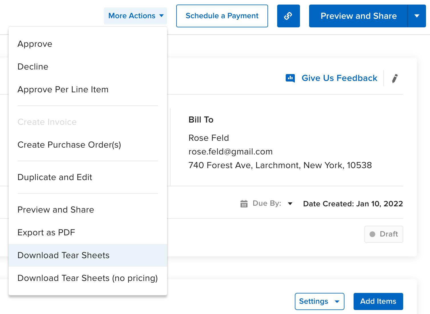With proposals on Houzz Pro, you have the flexibility to work in the way that best suits your needs – from the More Actions button at the top, you can download tear sheets from your proposal or export your proposal as a PDF.